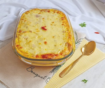 Distribua as fatias de queijo mussarela por cima e leve ao forno para assar por 35 minutos, a 180 °C, até firmar e dourar levemente por cima.